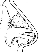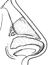 Figure a demonstrates normal lower lateral cartilage intact with alar rim. Figure b demonstrates how resection of the lower lateral cartilage can lead to elevation of the alar rim (see arrow).