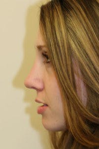 Patient in preoperative photo on figure a demonstrates retraction of her ala. Her alar retraction was as a result of overaggressive excision (nearly entirely removed) of her lower lateral cartilages creating a host of abnormalities in her nose including harsh cartilaginous details throughout the nose and more of a “scoop then she desired”. She had a revision rhinoplasty performed by Dr. Anil Shah (figure b) in which her nose was created to look closer to her original nose. Her alar rim was recreated with a combination of a cartilage graft in her left lower lateral cartilage and a modified alar rim graft to create an improved transition from her nasal tip to the ala. Her nasal tip was softened to remove her bossa from original surgery.